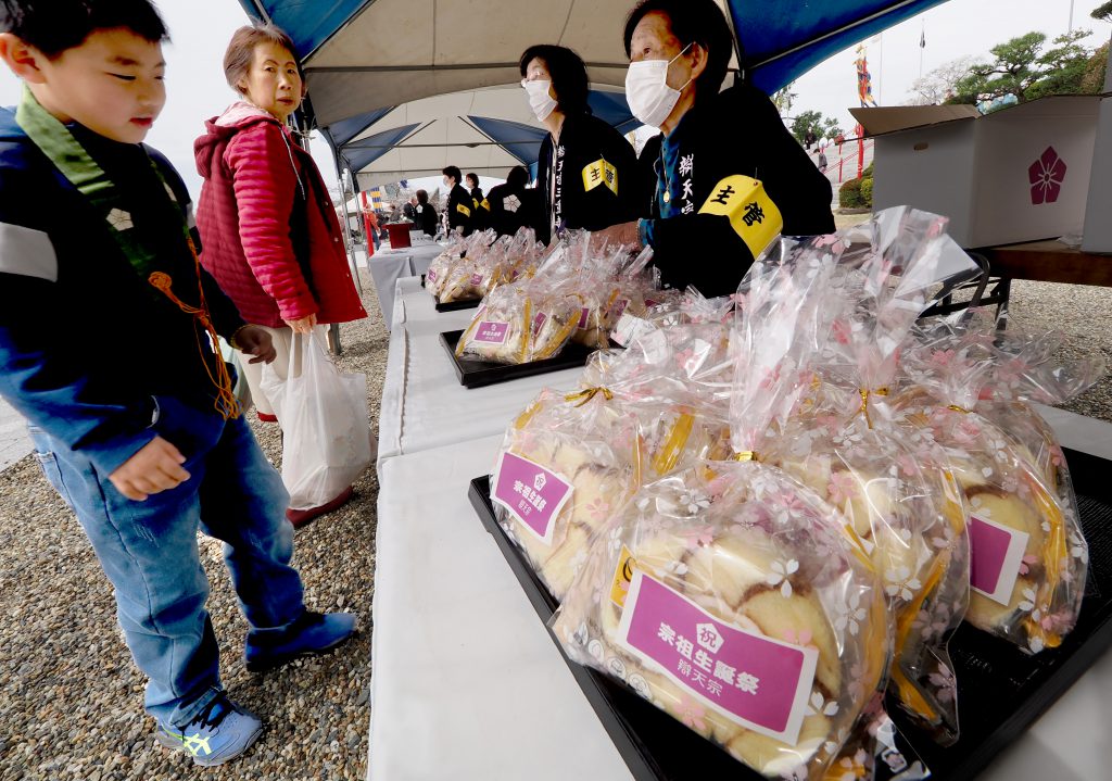 桜が満開になる境内において、甘茶の接待、辯天宗婦人部によるバザーが開催され、また、参拝された方全員にお祝いのロールケーキがふるまわれます。