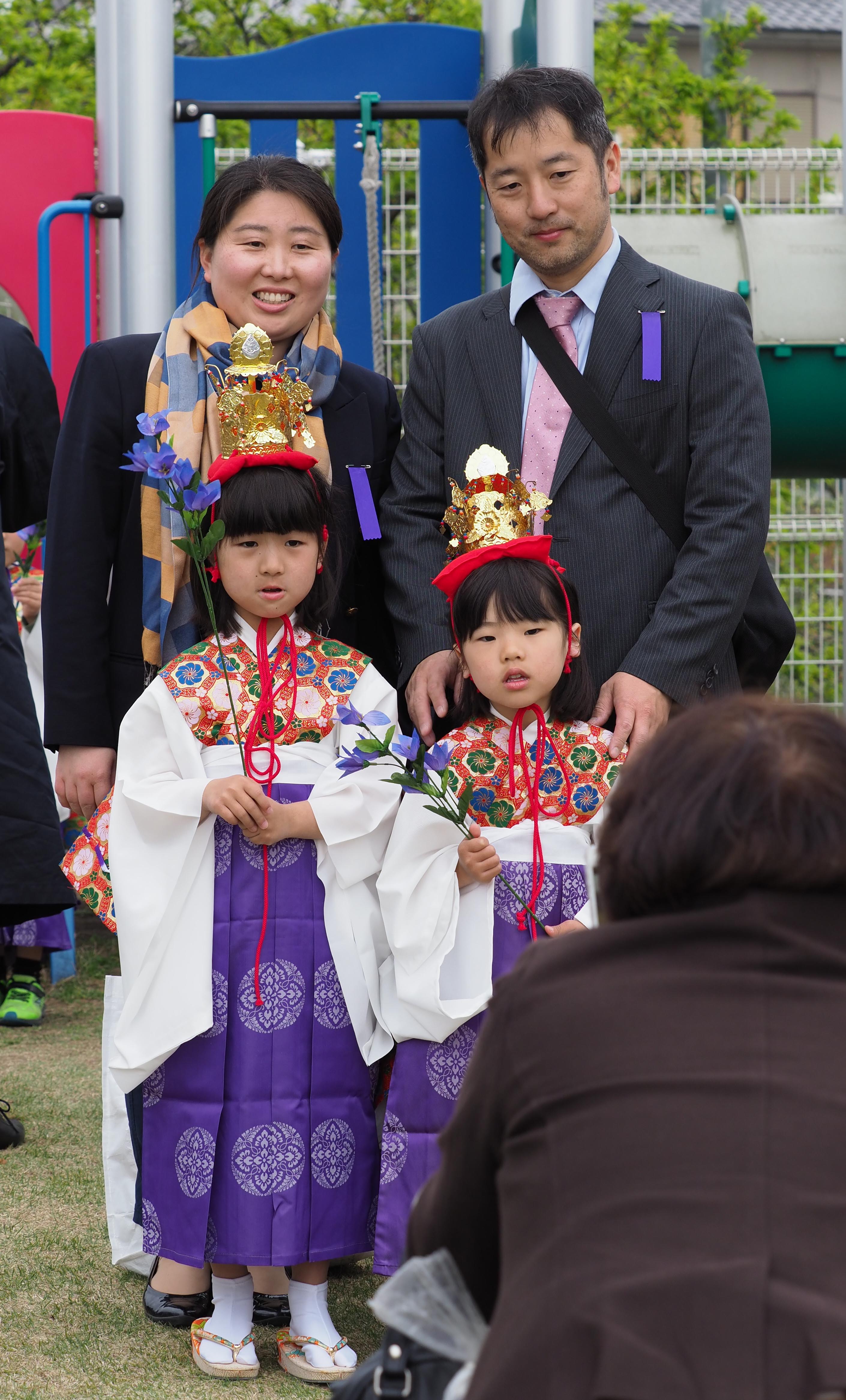 お父さん、お母さんらに手をひかれて歩くお稚児さんたち。