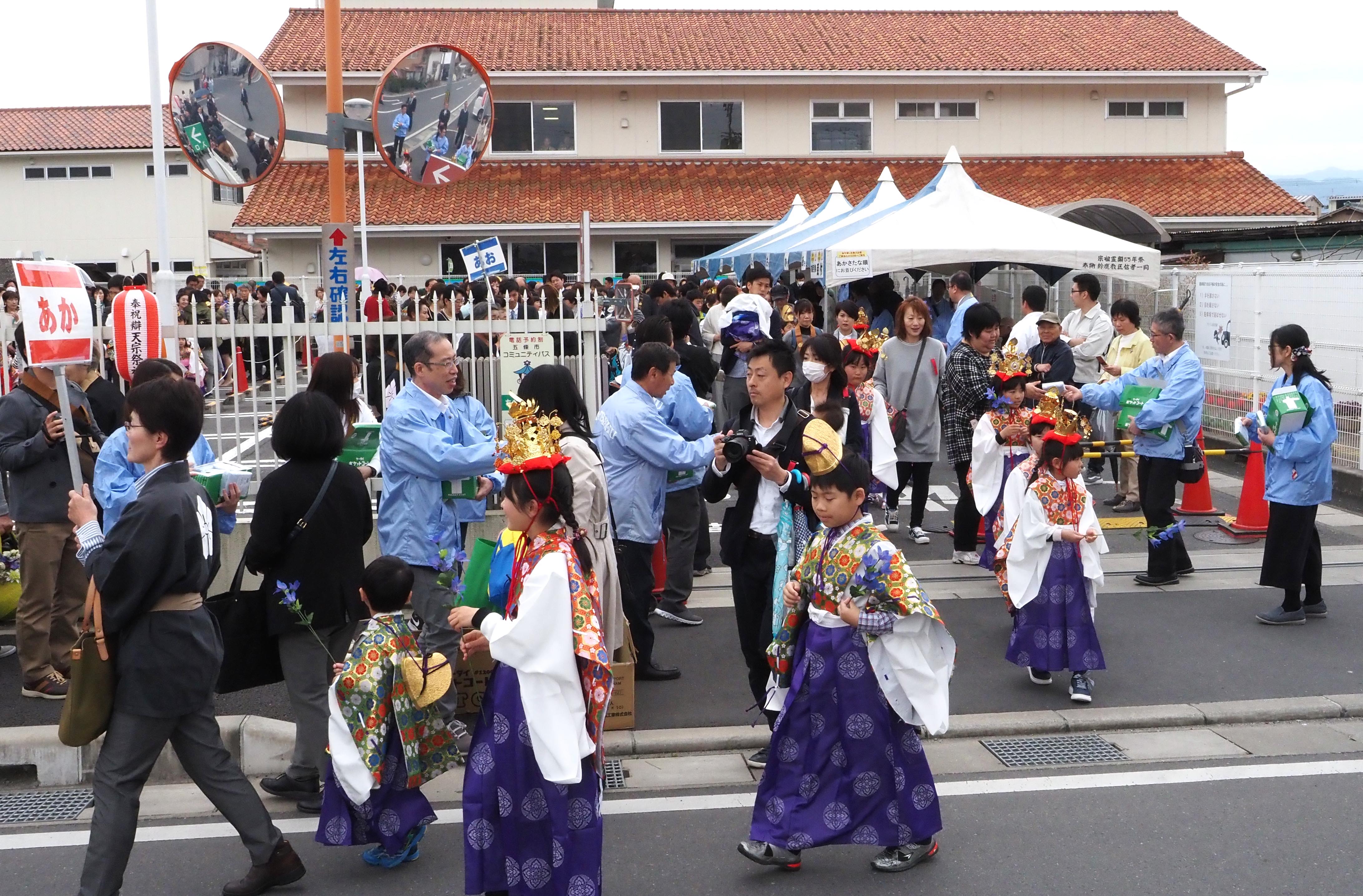 午前11時。五條市野原にあるちべん保育園から総本山如意寺まで約1kmの道を、子どもたちが稚児の衣装をまとい、家族らと一緒に華やかに練り歩きました。